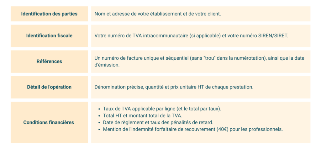 Pour être valide, toute facture émise doit impérativement comporter les informations suivantes :