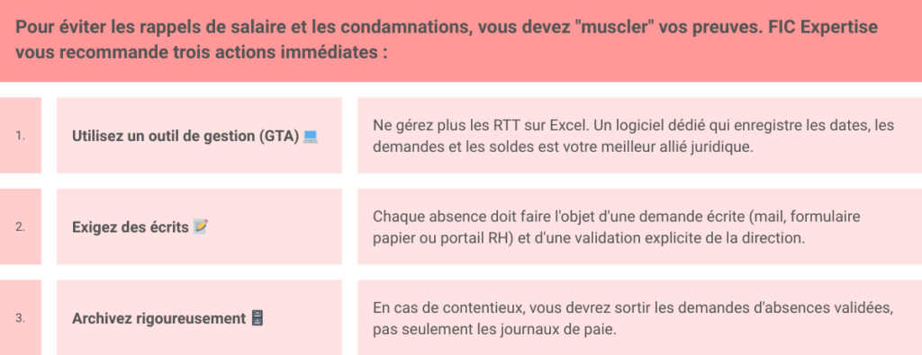 Anticipez ! La charge de la preuve pesant sur l’employeur, la rigueur administrative est votre seule assurance. Assurez-vous que vos procédures internes permettent de tracer qui a demandé quoi et quand.