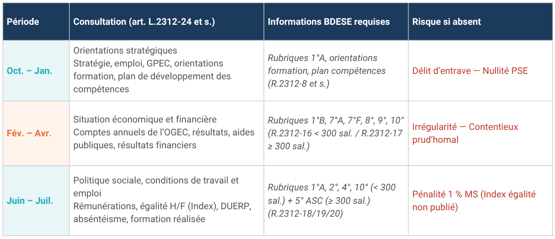 En l’absence d’accord prévu à l’article L. 2312-19 du Code du travail, les trois grandes consultations sont annuelles et doivent être organisées conformément aux articles L. 2312-24 et suivants. Le calendrier ci-après est calé sur l’année scolaire (septembre à août) et tient compte des périodes de vacances scolaires, déconseillées pour la tenue des réunions.
