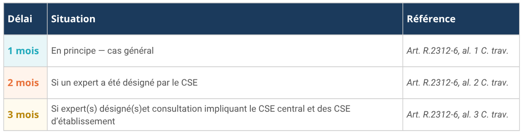 À défaut d’accord fixant des délais spécifiques, le CSE est réputé avoir été consulté et avoir rendu un avis négatif à l’expiration des délais suivants, décomptés à partir de la mise à disposition des informations dans la BDESE :
